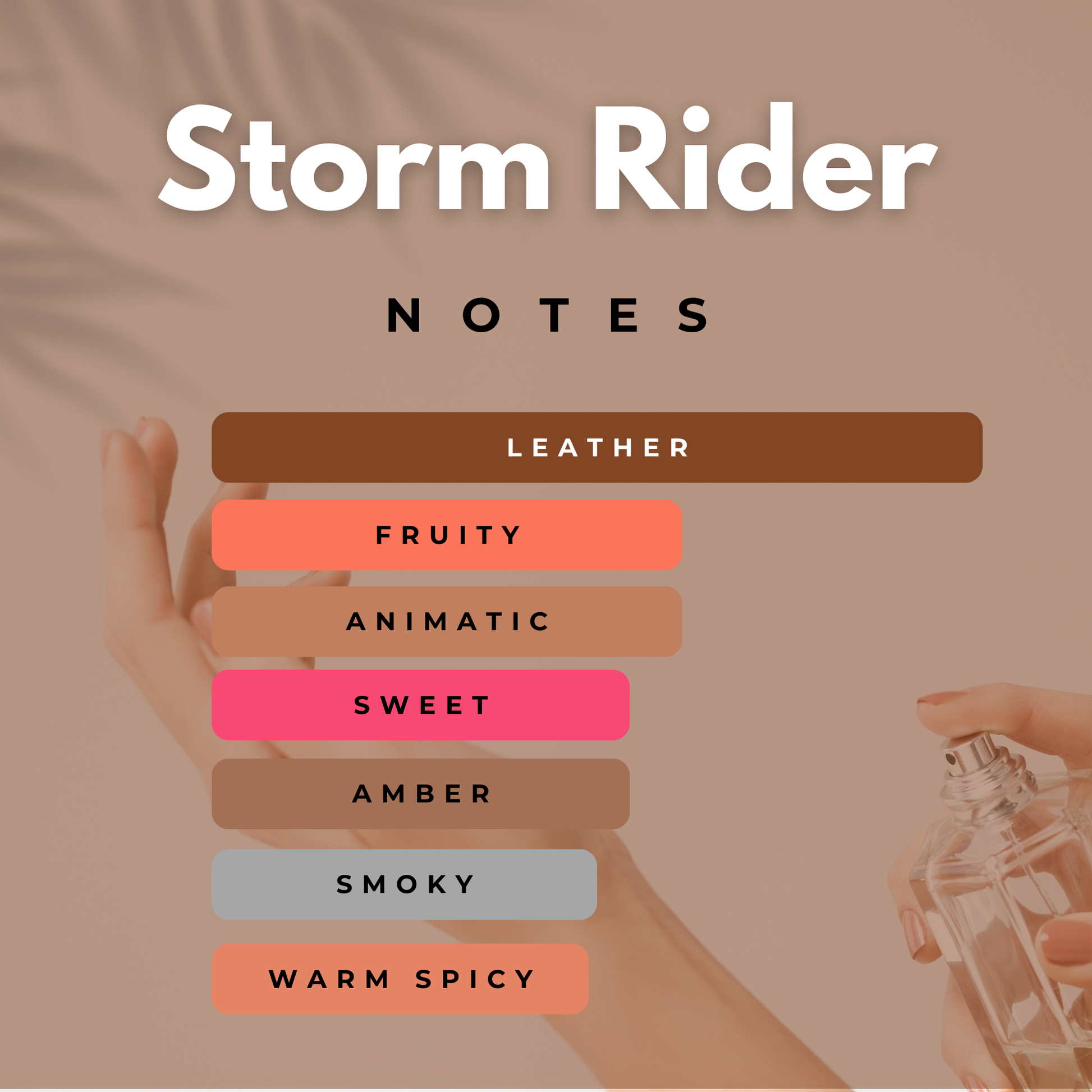 Unleash the power within with Storm Rider, a bold and untamed fragrance crafted for men who fear nothing and conquer everything. This intoxicating blend opens with the deep richness of leathery intensity, igniting a fire of confidence and raw masculinity. The heart pulses with the warm, golden glow of amber, adding depth and undeniable allure. Finally, a trail of smoky mystique lingers, leaving an unforgettable impression—powerful, daring, and unstoppable.